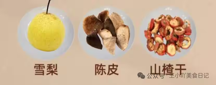 材料:雪梨1個(帶皮)、陳皮3g、山楂干5g、清水500ml