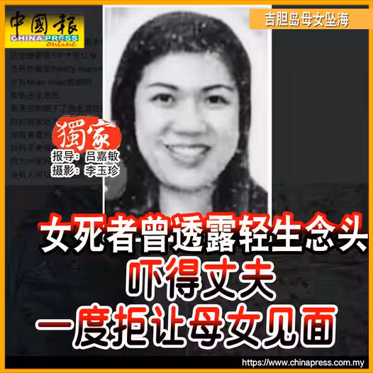 女死者為41歲華裔婦女林美蓮,她帶著年僅3歲的女兒離開位於莎阿南的住家後,前往吉膽島碼頭,最終一同墜海身亡。