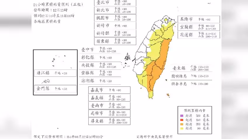 最新一波風雨預報顯示,明天下午前,高雄市山區以及台東縣山區的24小時累積雨量將突破停班課標準。