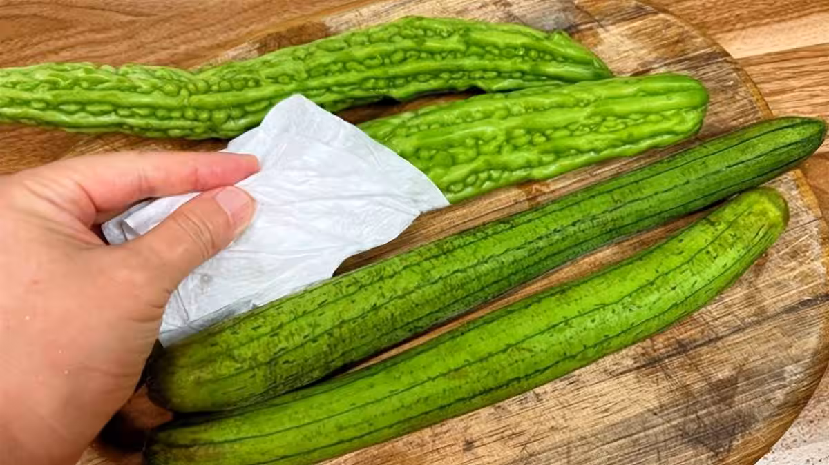 然後再把苦瓜表面的水分晾乾或者是用廚房紙巾吸干苦瓜表面的水分。像我們常吃的冬瓜、絲瓜、黃瓜都可以利用這種方法保存。