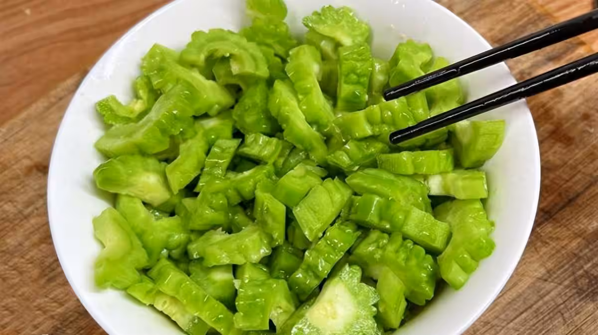 焯水後的苦瓜用漏勺撈出來,放案板上自然放涼,晾乾水分的苦瓜放入適量的食用油,用筷子攪拌均勻,把每個苦瓜上面均勻地裹上一層食用油。