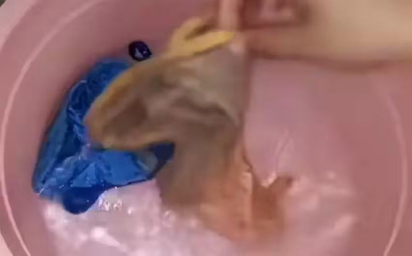 洗好後,再次擰乾毛巾,你會發現清洗兩次後的毛巾水依然有些髒,可以多清洗一次,然後再試試這條淺色毛巾,它的表面已經微微發黃。