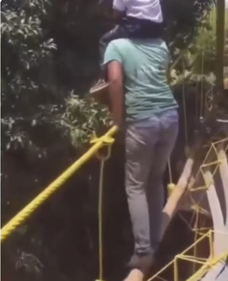 然而,就在母子兩人走到橋的中段時,意外發生了——橋上的原木突然滑動,年輕媽媽腳下一滑,重心瞬間失控!雖然她及時抓住橋上的繩索,沒有掉下溪谷,但肩膀上的孩子卻毫無防備,直接從她身上摔落下去,墜入了橋下的溪谷之中。