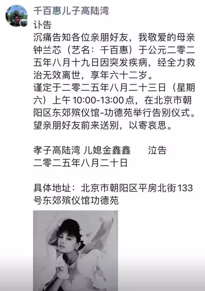 黃安晚間在微博哀悼寫道,告訴大家一個傷心的消息,台灣著名歌手、我的多年好友千百惠於8月19日凌晨因病去世,享壽62歲。百惠與我相識47年,我倆高中時就認識了。我與百惠是新竹同鄉,當時她在黃包車西餐廳演唱,我去面試歌手,負責面試的就是百惠。