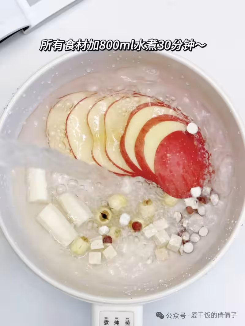 1️⃣ 茯苓、蓮子、芡實沖洗乾淨; 2️⃣ 蘋果塊、山藥片與所有乾貨入鍋; 3️⃣ 加600ml清水; 4️⃣ 大火煮開轉小火燉30分鐘。 💡倩倩提醒:干山藥片需提前浸泡半小時縮短煮制時間。