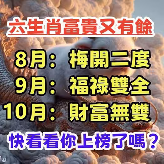六生肖富貴又有餘,8月梅開二度,9月福祿雙全,10月財富無雙!