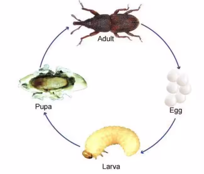 由於體型較小,並且蟲卵寄蛀較深,在收割和加工的過程中,這些蟲卵也較難驅除,在適宜的條件下,它們便會孵化成蟲。