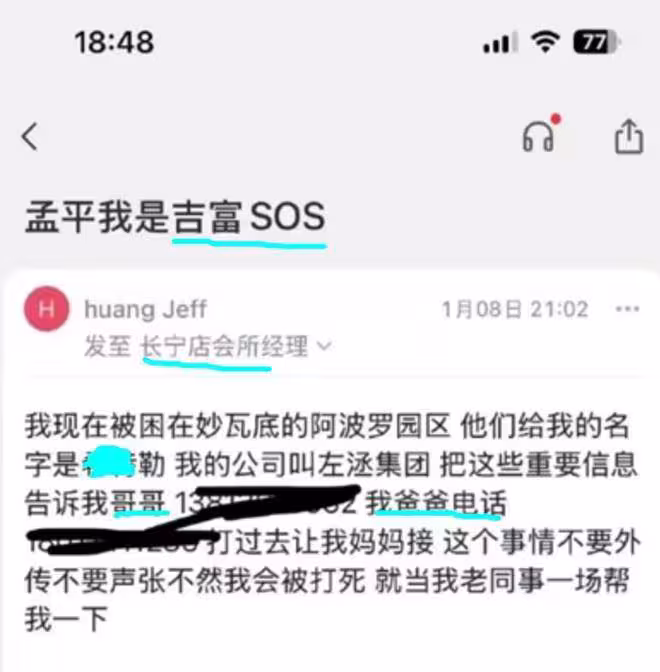 「黃吉富」稱目前身處妙瓦底的阿波羅園區,並稱詐騙集團為他取了代號「希特勒」。該名員工提到,集團的名稱為「左洆集團」,並提供家人的聯絡方式,希望外界能通知其母親,也懇求外界不要聲張,因為一旦消息走漏,他可能會被打...死。