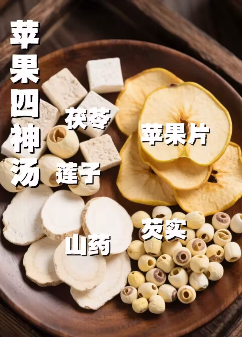 1、準備酸茯苓、蓮子、山藥、芡實 、蘋果片