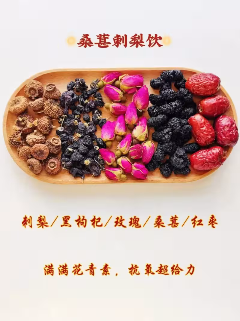 1、準備桑葚、刺梨、玫瑰、紅棗、平陰玫瑰、黑枸杞