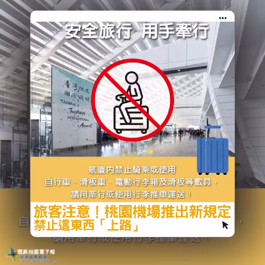 桃園機場近日公告,禁止旅客在航廈內騎乘或使用電動行李箱,並呼籲旅客配合安檢和航廈秩序維護。