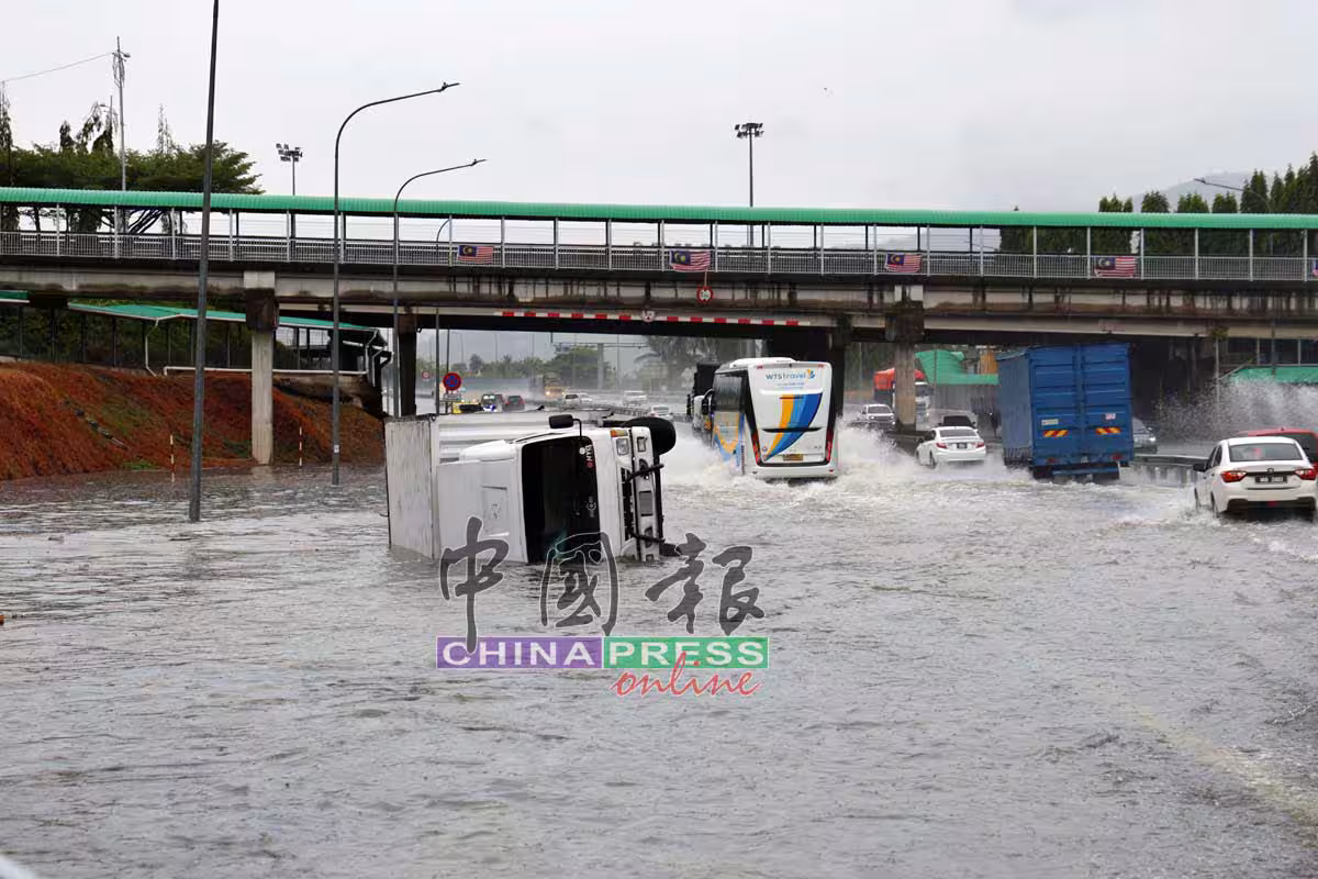 與此同時,受淹水影響,芙蓉雙溪烏絨路的收費站進入大道的車龍已開始出現緩慢移動的情況。儘管如此,在南北大道員工及交警的協助下,現場交通秩序仍維持受控。