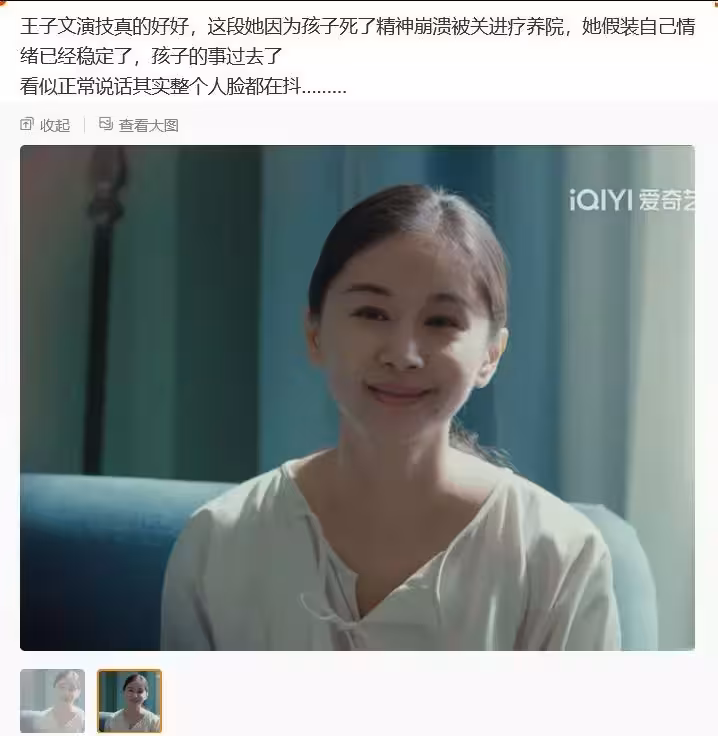 這部劇中,王子文的演技被誇了,這幾年她通過沉澱,把這個曲桐演得入木三分,在療養院精神崩潰,要強裝已經康復,面上在笑,眼下肌肉在抽搐,很明顯看出來她的不對勁。