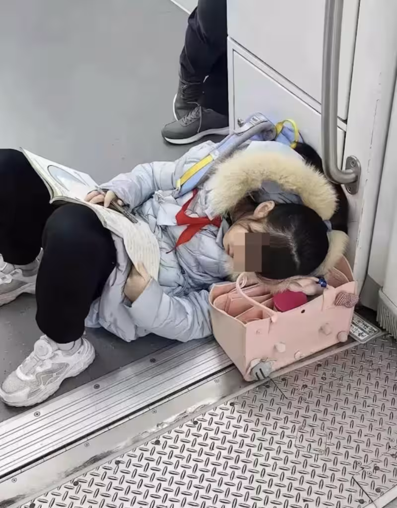 照片中可見,這位小女孩穿著藍色外套,直接在車廂地板呼呼大睡,但即使在睡夢中,小女生的手仍緊緊抓著練習簿,仿佛連睡覺時刻都無法真正放鬆,雖然她試圖縮起雙腿避免占用太多空間,但仍然占據了半條通道。當時不少乘客正在車廂內移動,座位幾乎都被坐滿,但儘管周遭全都是人,小女孩卻累到顧不得周遭環境,頭還枕在隨身攜帶的手提袋上。