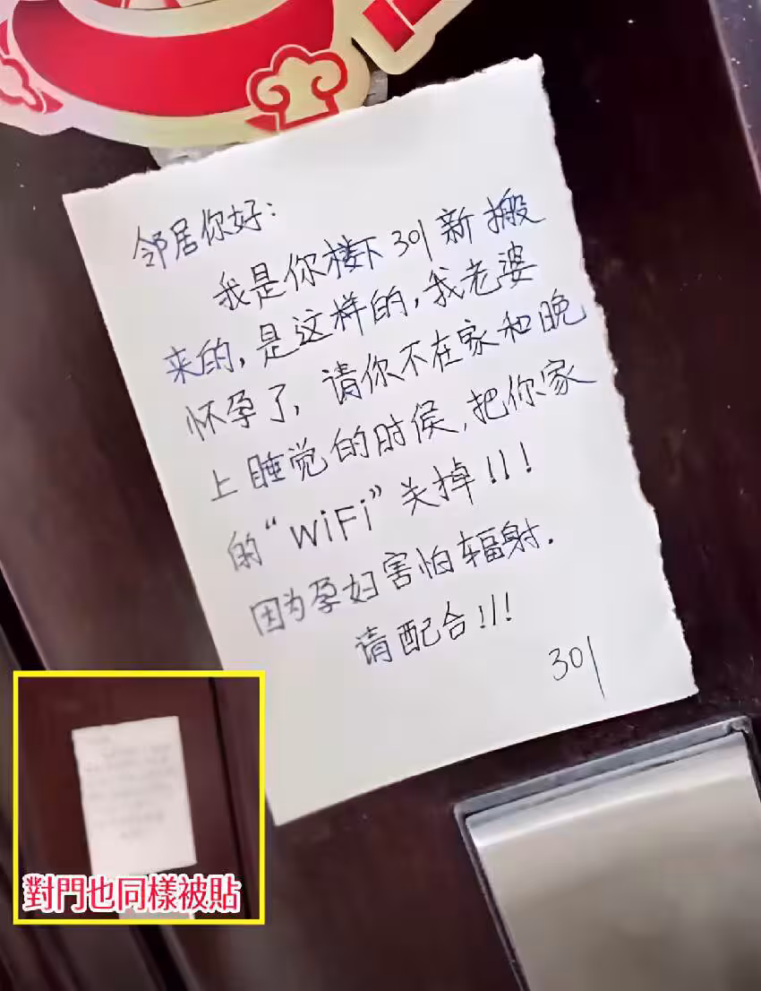 樓下新搬來的鄰居因為家裡有孕婦,貼了一張紙條,要求樓上晚上關掉WiFi,因為怕輻射對孕婦不好。
