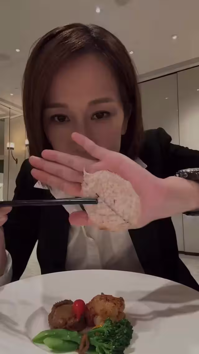 只見她的碟子裡有鮑魚等食物。當她夾起其中一樣食物向網友展示後,隔壁的湯盈盈立即伸手過來把筷子上的食物捏碎。文頌嫻瞬間「無語黑臉」,而湯盈盈隨即發出呵呵呵的笑聲。相信,文頌嫻說的座位編排失當,說的就是湯盈盈坐在她身邊了。