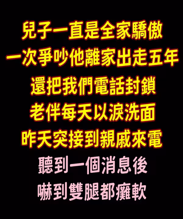 兒子一直是全家驕傲,一次爭吵他離家出走五年,還把我們電話封鎖,老伴每天以淚洗面,昨天突接到親戚來電…「聽到一個消息」嚇到雙腿癱軟...
