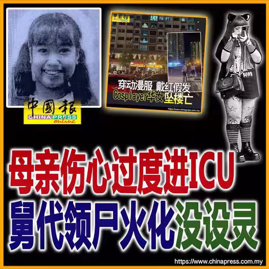 (檳城5日訊)」Cosplayer華女墜樓身亡案」,34歲女死者的母親相信因傷心過度,昨日身體不適緊急入院,目前仍在加護病房接受治療,並沒現身醫院太平間領屍。