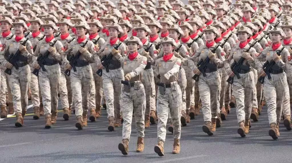 檢閱隊伍中,女民兵們身穿迷彩服,身姿挺拔如松,目光銳利而堅毅,每一步正步都踏得鏗鏘有力,盡顯巾幗風采。
