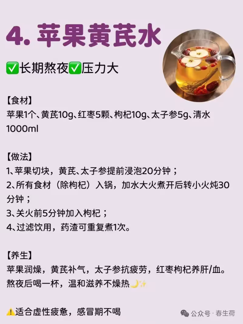 蘋果切塊,黃芪、太子參提前浸泡 20 分鐘,所有食材(除枸杞)入鍋,加 1000ml 清水大火煮開後轉小火燉 30 分鐘,關火前 5 分鐘加入枸杞,過濾飲用,藥渣可重複煮 1 次。