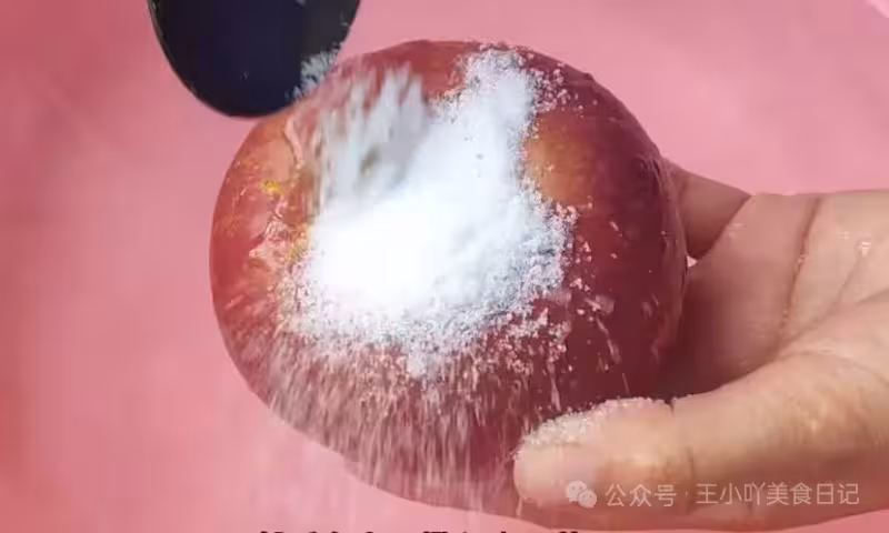 2.洗蘋果:把蘋果打濕,撒上一點鹽搓洗表皮(這樣能去掉果蠟),沖洗乾淨後擦乾。