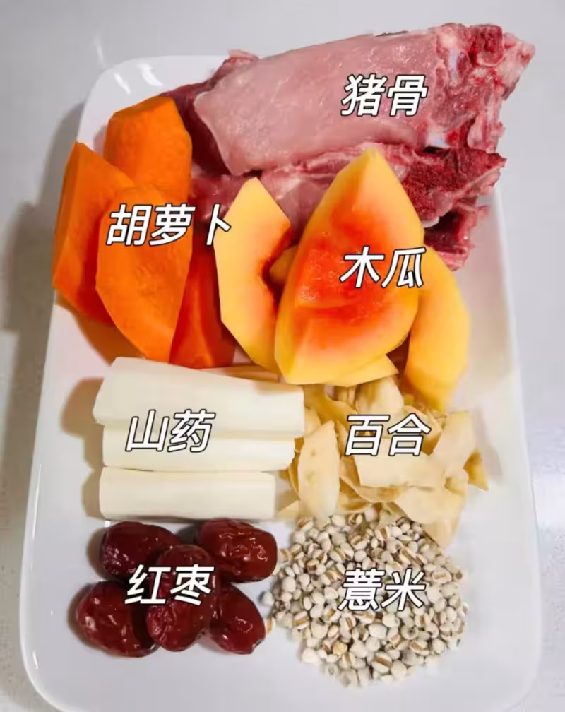 食材:豬骨、木瓜、紅蘿蔔、淮山、薏米、百合、紅棗