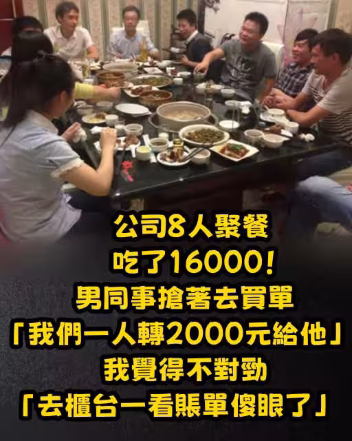 公司8人聚餐吃了16000! 男同事搶著去買單「我們每人轉帳2000元給他」,我覺得不對勁「去櫃檯一看帳單傻眼了」