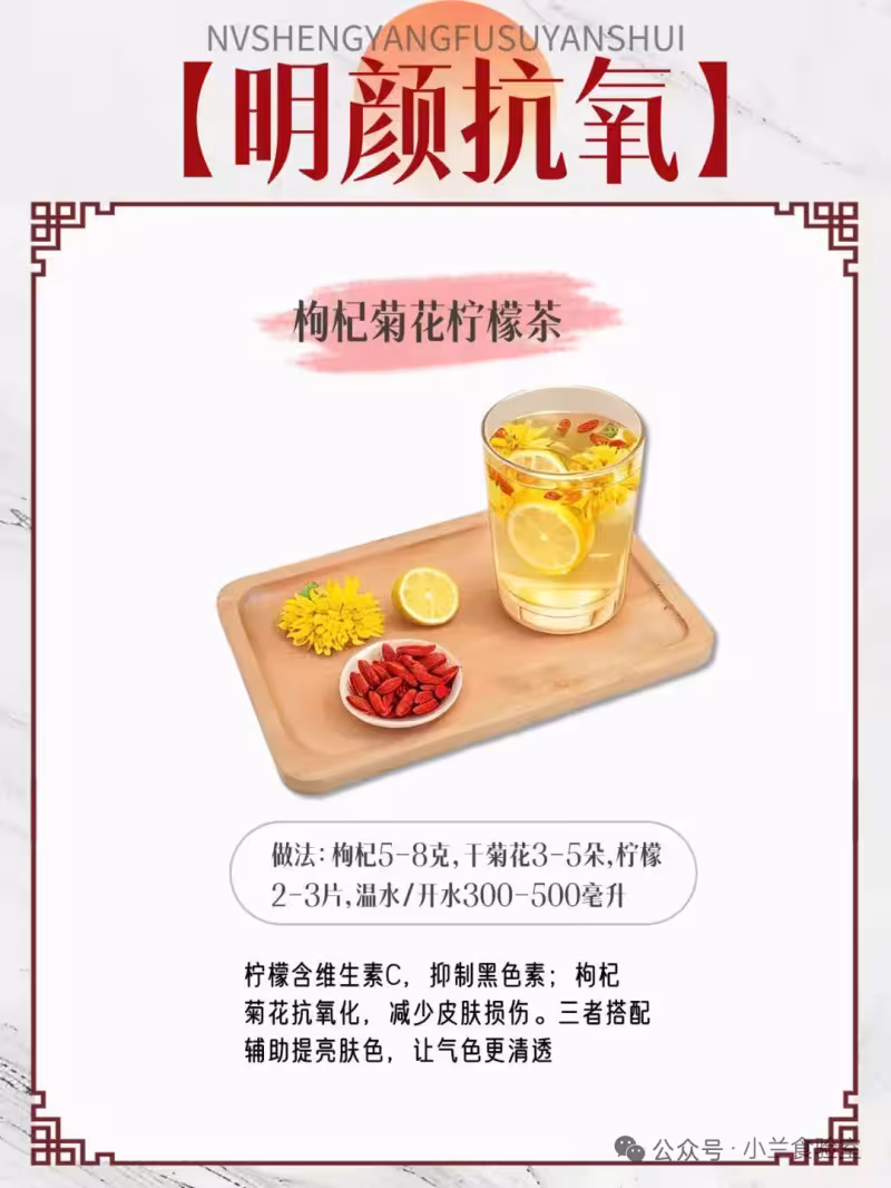🧂做法:枸杞5-8克,干菊花3-5朵,檸檬2-3片,溫水/開水300-500毫升