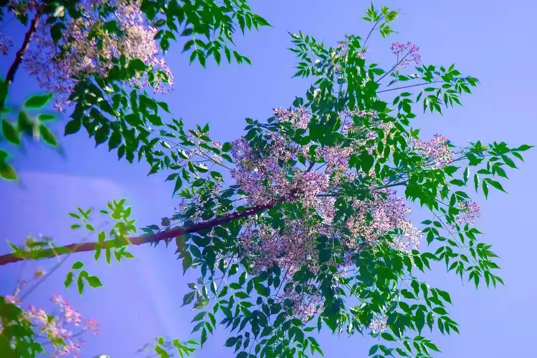 在他的筆下,苦楝花如同帝王儀仗中的華蓋,散發著馥郁的芬芳,紫色的細小花朵垂落,如同美人頭上的流蘇。