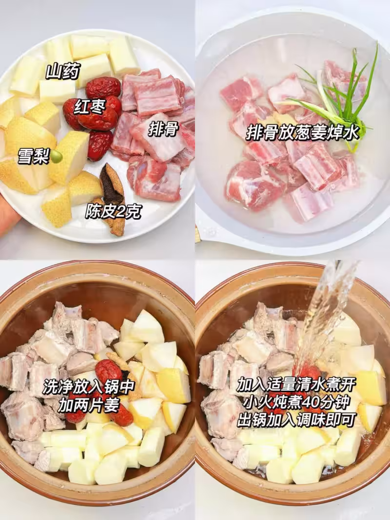 ✅ 食材: 排骨、雪梨、紅棗、鐵棍山藥、陳皮2克、薑片