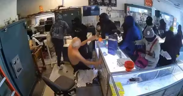 閉路電視的片段顯示,一輛SUV倒車撞破「金興珠寶店」珠寶店的大門,十幾個蒙面匪徒走進店裡,大喊:「所有人伏下!」手拿鐵錘砸碎展櫃、搶走商品。還有人持手槍,粗暴推倒88歲店主,導致他被玻璃刺傷。匪徒得手隨後揚長而去。