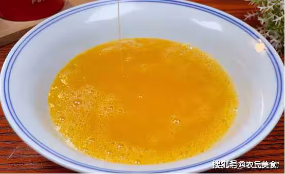 5、鍋中油熱,倒入打散的雞蛋液,用中火煎熟至凝固,盛出來備用。
