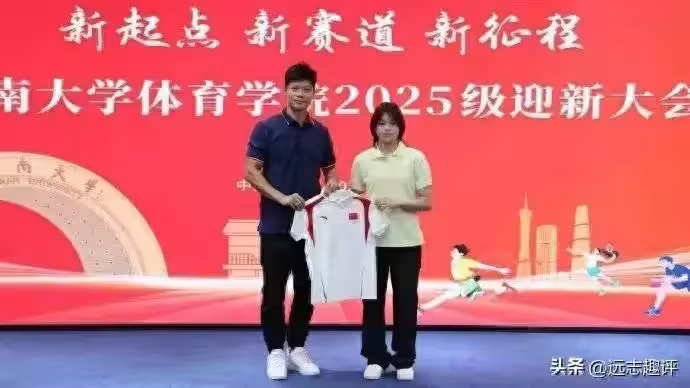 在迎新生大會上,全紅嬋和蘇炳添兩人坐在一起,蘇炳添還代表學院接受了全紅嬋捐贈的帶親筆簽名的巴黎奧運會出場服,從現場照片看,全紅嬋確實發育不少,體格也比之前壯了不少,而且是披髮,全身上下散發著青春氣息。