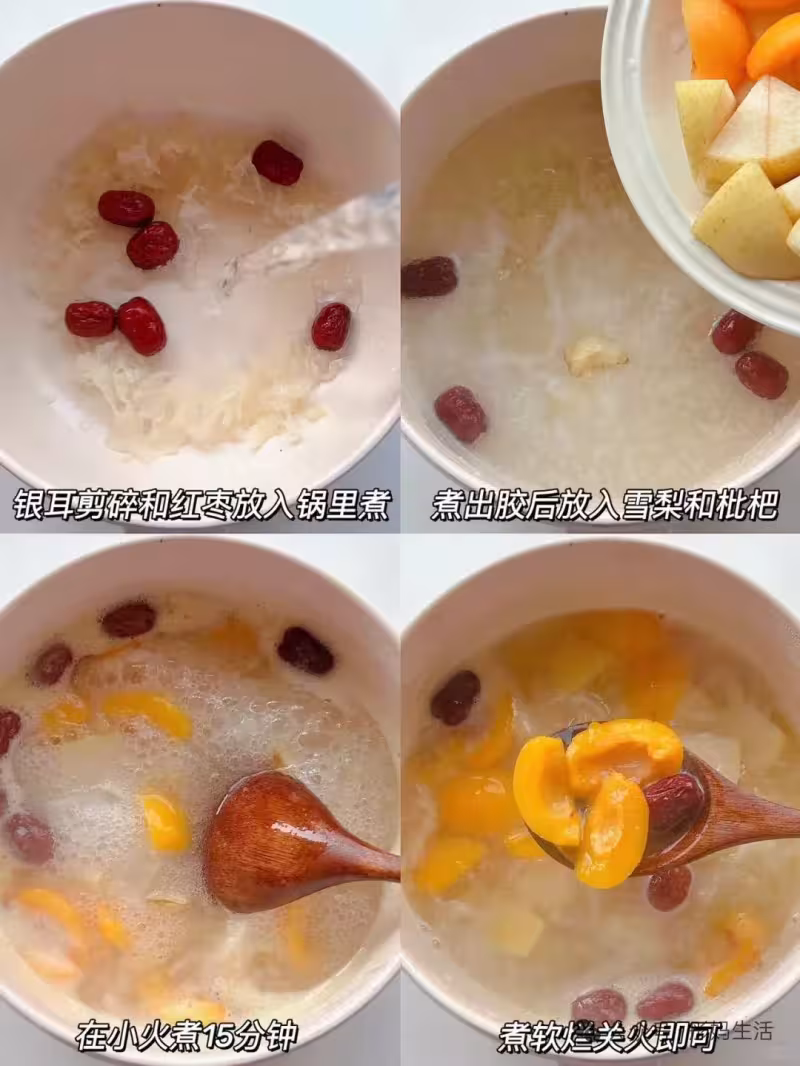 2. 銀耳、紅棗加水煮出膠質,放雪梨、枇杷小火煮15分鐘至軟爛即可。