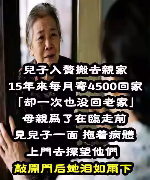 兒子入贅搬去親家!15年來每月寄4500回家「卻一次也沒回老家」...母親為了在臨走前見兒子一面,拖著病.體上門探望「敲開門她淚如雨下....」