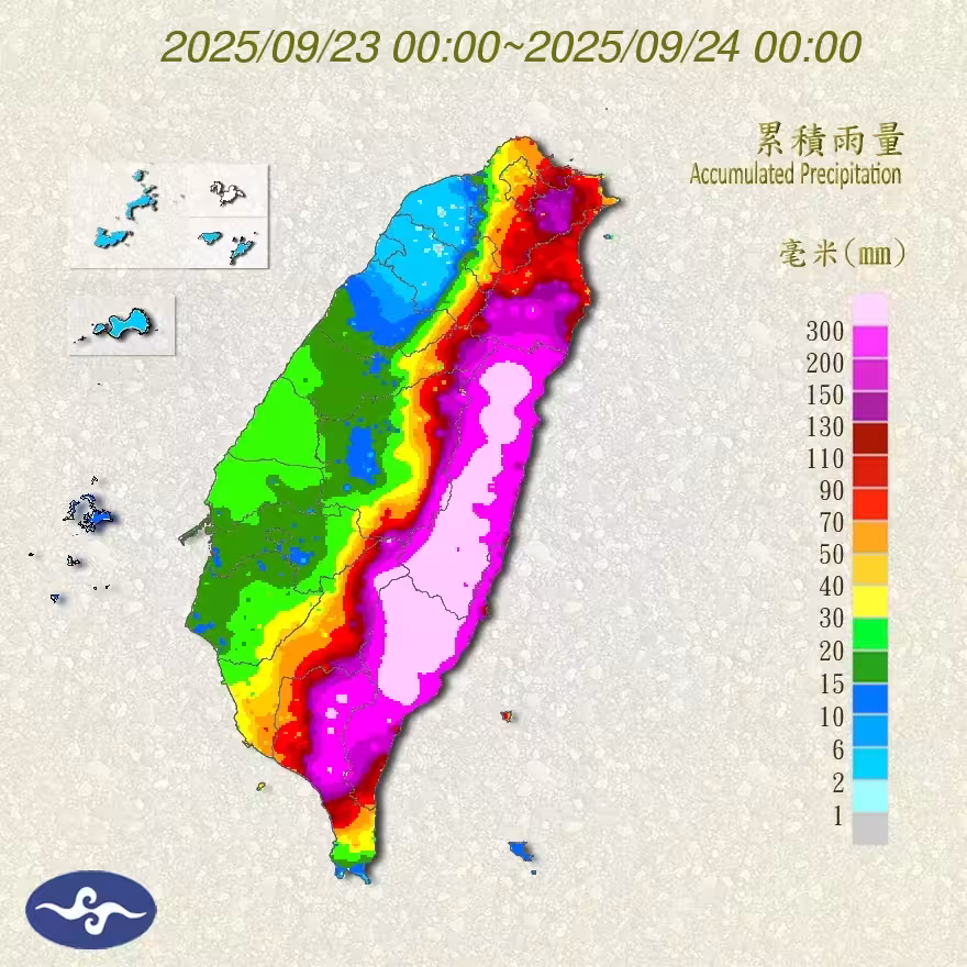 強台樺加沙雖已離開,仍對台灣東部造成嚴重災害,尤其東半部地區、南部山區有局部豪雨等級以上降雨。根據中央氣象署昨晚 (23) 10點半統計資料,花蓮縣天祥測站累積雨量已高達612.0mm ,台東縣多處測站雨量也都下超過500mm。氣象署持續發布豪雨特報及陸上強風特報!