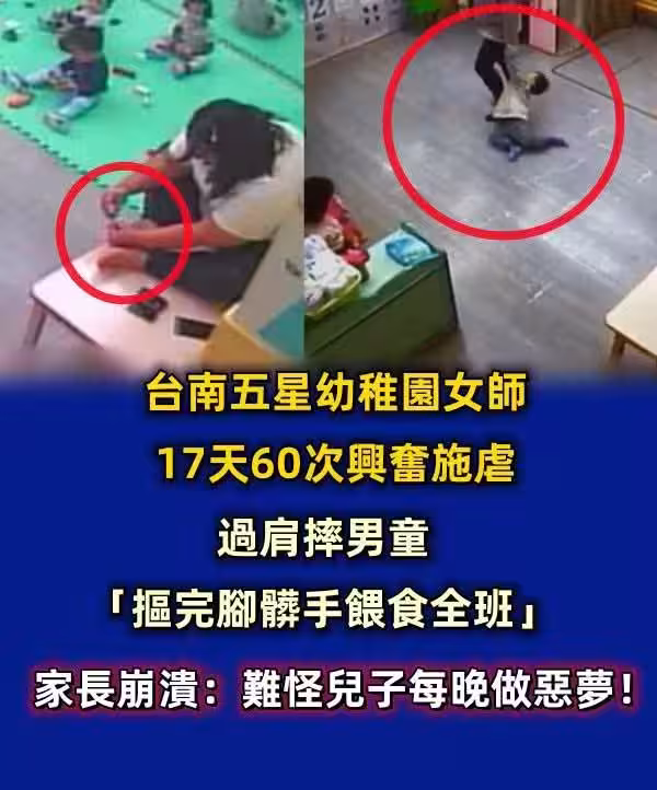 台南五星幼稚園女師17天60次興奮施虐,過肩摔男童「摳完腳髒手餵食全班」家長崩潰: 難怪兒子每晚做惡夢