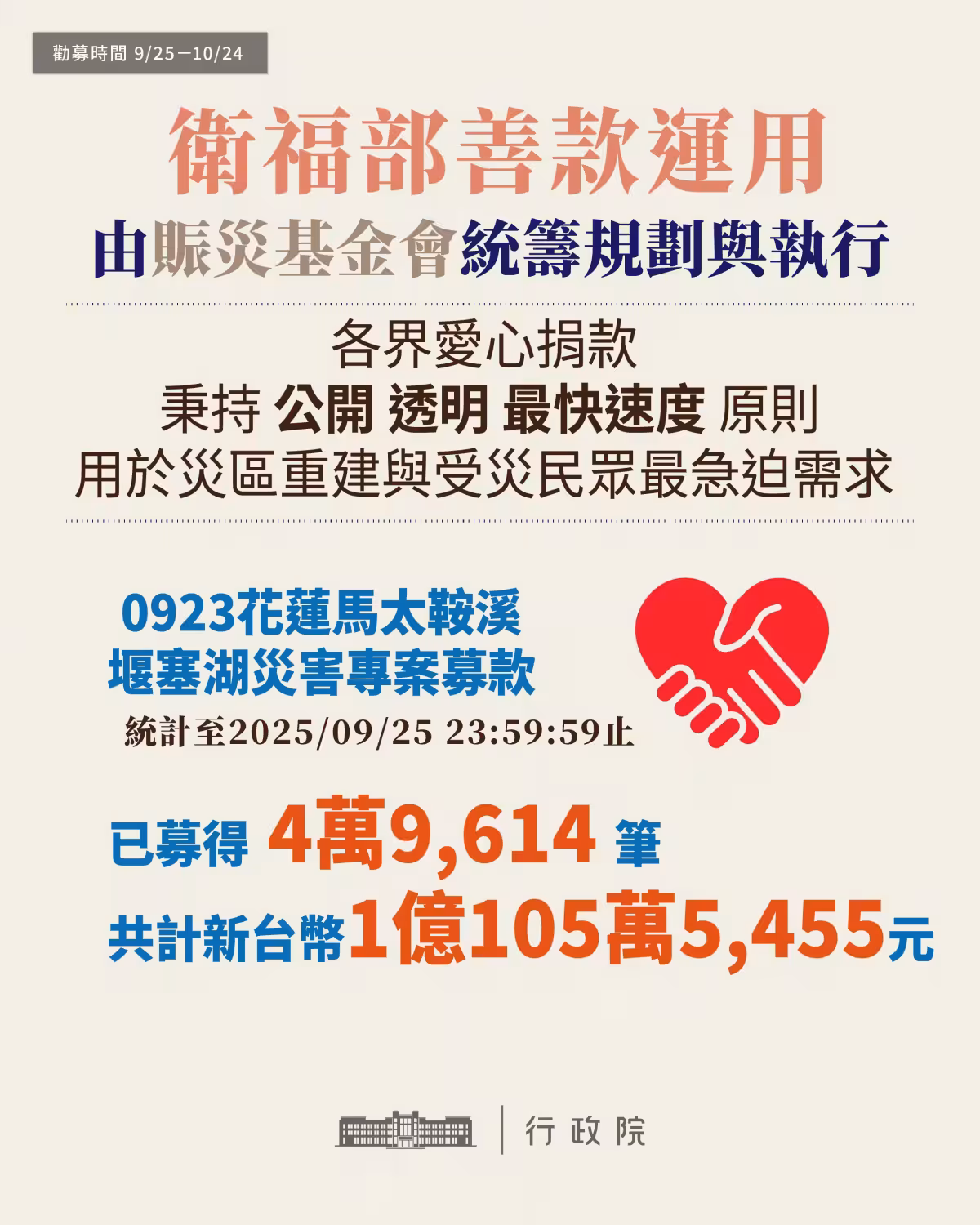 衛福部表示,所有捐款將由賑災基金會統籌規劃,秉持公開透明原則,優先用於災區重建與受災民眾最迫切需求,確保每筆愛心善款都能發揮最大效益。