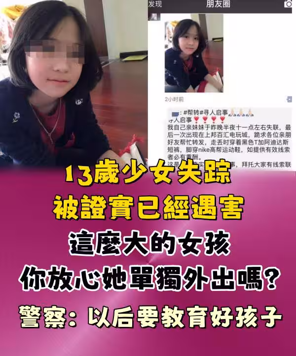 13歲少女失蹤被證實已經遇害,這麼大的女孩你放心她單獨外出嗎?警察:以後要教育好孩子!!