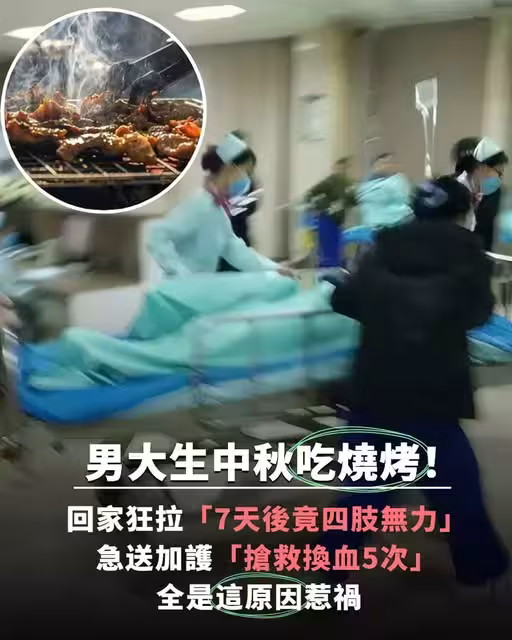 中秋節吃燒烤!男大生回家狂拉「7天後竟四肢無力」急送加護「搶救換血5次」全是這原因惹禍
