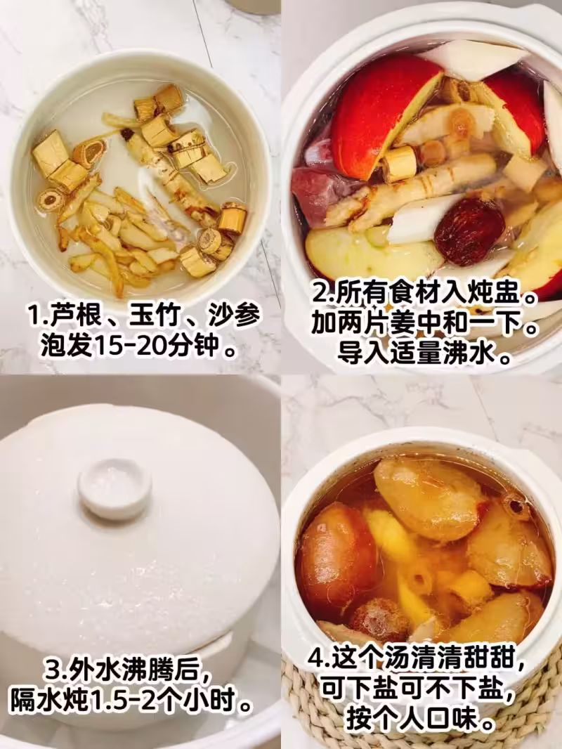 秋冬天氣乾燥,容易感覺皮膚緊繃、喉嚨干癢,甚至乾咳不止。這款沙參玉竹蘋果湯,搭配蘆根和山藥,既能滋陰潤肺,又能健脾生津,尤其適合經常熬夜的人群。