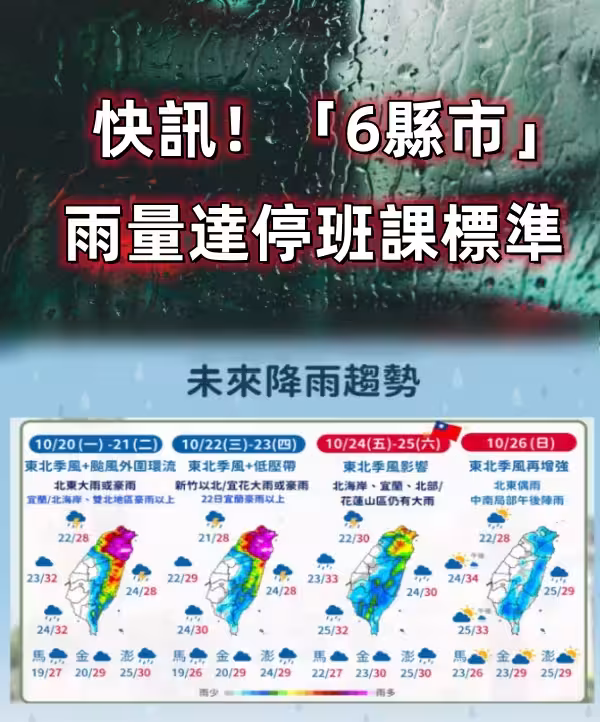 據中央氣象署最新的風雨預測顯示,從下午2點至明 (21) 日下午2點,共有6縣市的雨量預估將達到停止上班上課的標準。