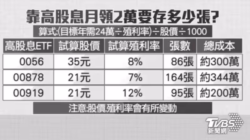 現在許多人將ETF視為退休金規劃的主要工具,期待未來靠ETF配息養老,但這並非易事,需要足夠的部位。以市面討論度較高的3檔高股息ETF(0056、00878、00919)來看,若要月領2萬元,每年本金需求共24萬。根據近期年化殖利率表現和股價計算,0056需要約86張,投入成本約300萬元;00878需要164張,成本約344萬;00919約95張,成本約200萬。投資人也可以分散布局,組合成月月配,但必須注意股價和殖利率都會有所變動。