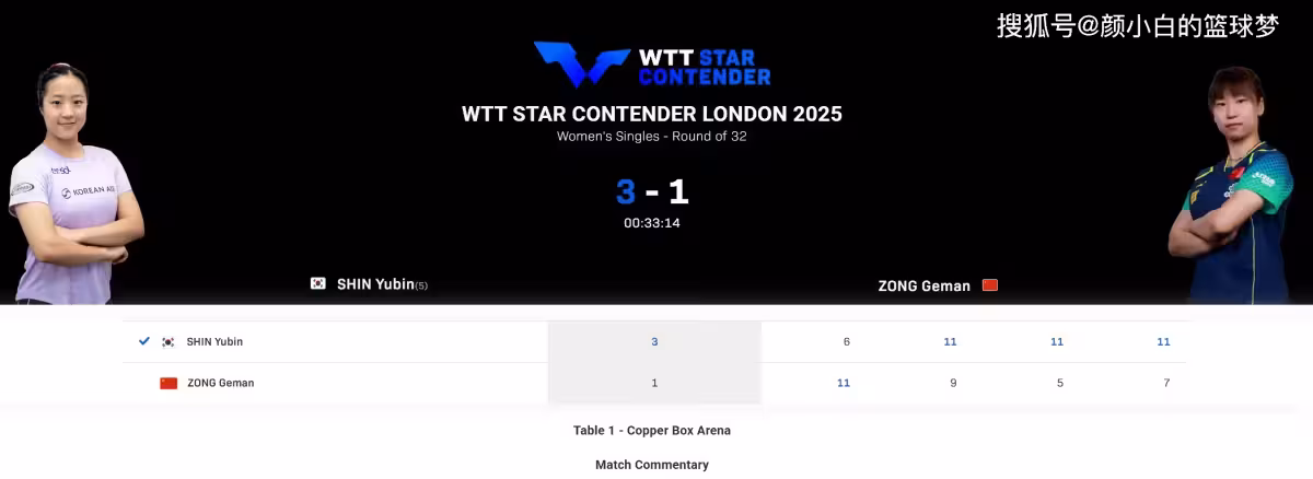 北京時間10月25日凌晨,WTT倫敦球星挑戰賽女單1/16決賽,國乒選手縱歌曼1-3不敵韓乒選手申裕斌,四局比分:11-6、9-11、5-11、7-11。也就是在大比分1-0領先的情況下連丟三局,這場比賽算是徹頭徹尾的慘敗了。