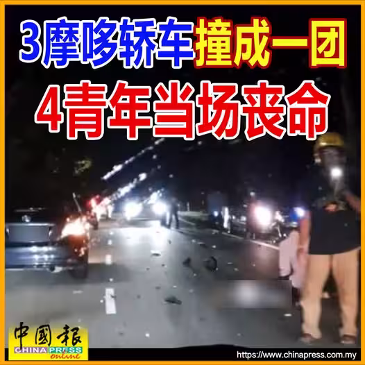 (東甲25日訊)新村路段發生嚴重車禍,各籍青年分乘的3輛摩哆與一輛轎車猛撞成一團,造成4人包括一對華裔青年男女,當場喪命!