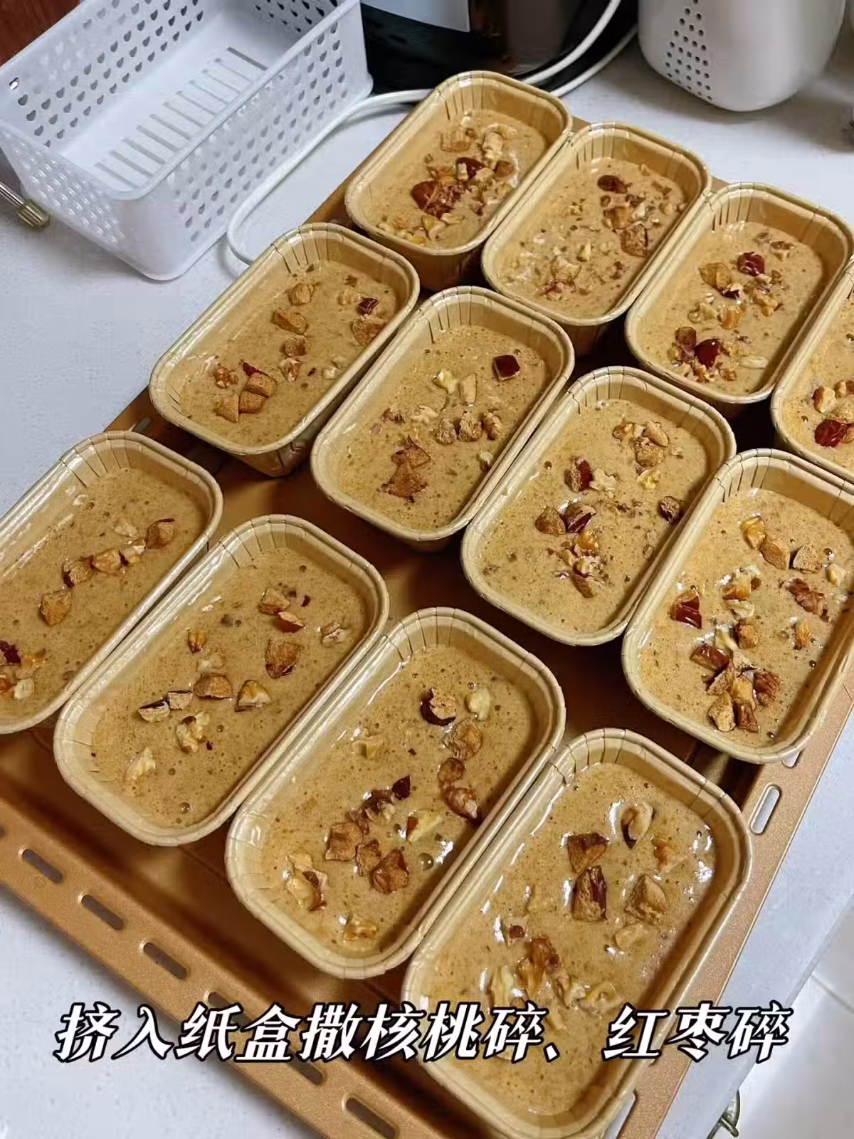 4.擠入紙杯8分滿表面撒上紅棗碎、核桃碎送入提前預熱好的烤箱