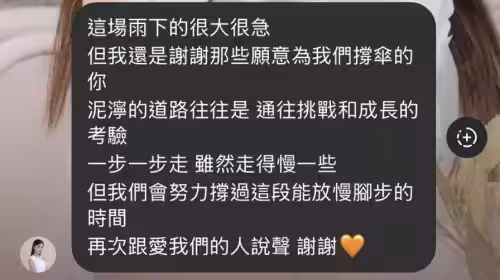 書偉老婆首發聲 直言「這場雨下得很大很急」