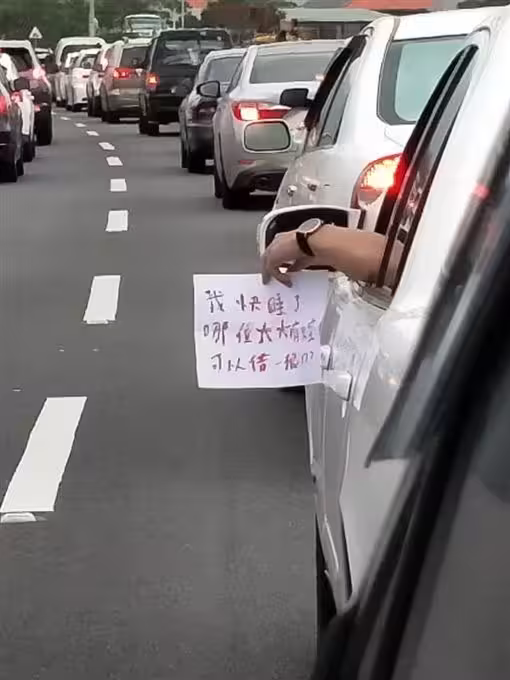 假日出遊塞在國5!愛睏駕駛撐不住「搖下車窗求救」 網細看「紙條上內容」笑歪:不幫沒人性…
