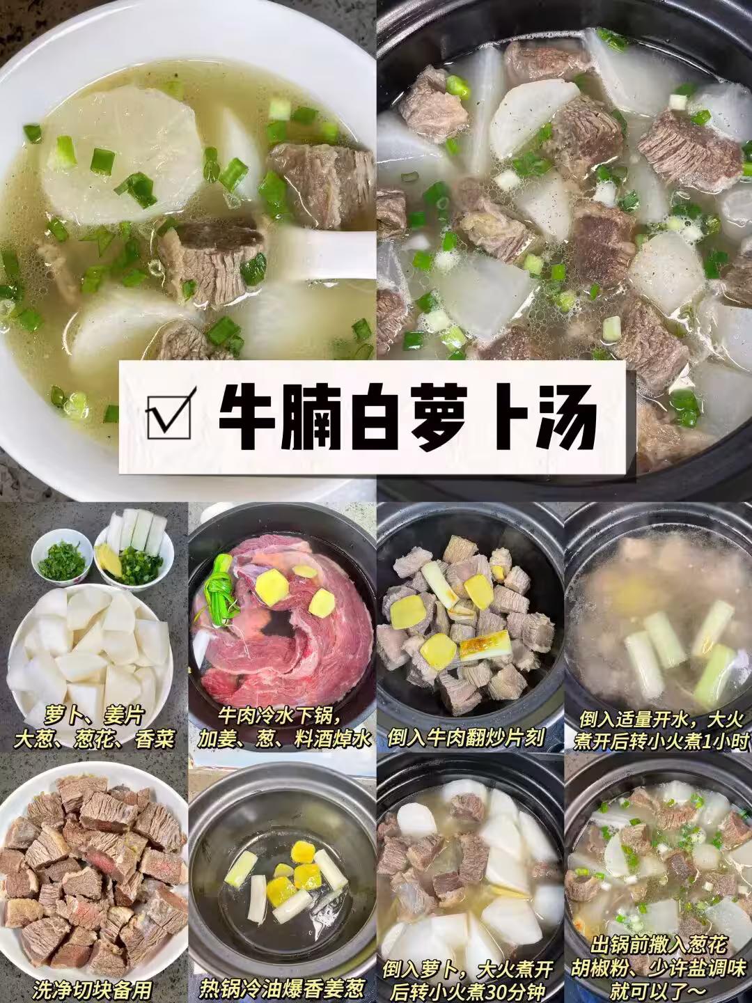 製作步驟: 蘿蔔、薑片 大蔥、蔥花、香菜 牛肉冷水下鍋, 加姜、蔥、料酒焯水 洗凈切塊備用 熱鍋冷油爆香姜蔥 倒入牛肉翻炒片刻 倒入適量開水,大火 煮開後轉小火煮1小時 倒入蘿蔔,大火煮開 後轉小火煮30分鐘 出鍋前撒入蔥花 胡椒粉、少許鹽調味 就可以了~