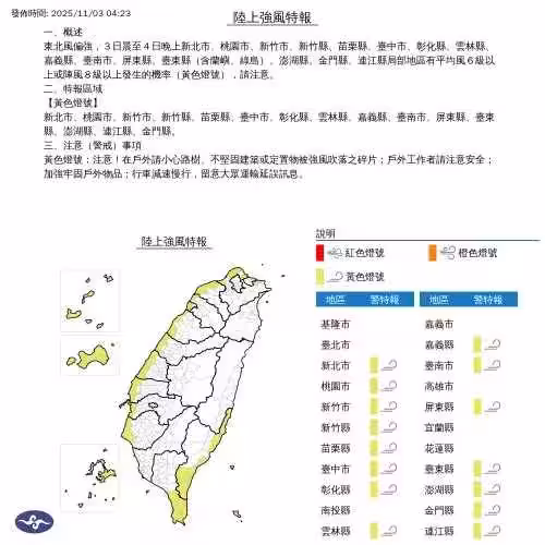 氣象署今清晨發布陸上強風特報,提醒東北風偏強,今日晨至明(4)日晚上新北市、桃園市、新竹市、新竹縣、苗栗縣、台中市、彰化縣、雲林縣、嘉義縣、台南市、屏東縣、台東縣(含蘭嶼、綠島)、澎湖縣、金門縣、連江縣局部地區有平均風6級以上或陣風8級以上發生的機率(黃色燈號),請注意。